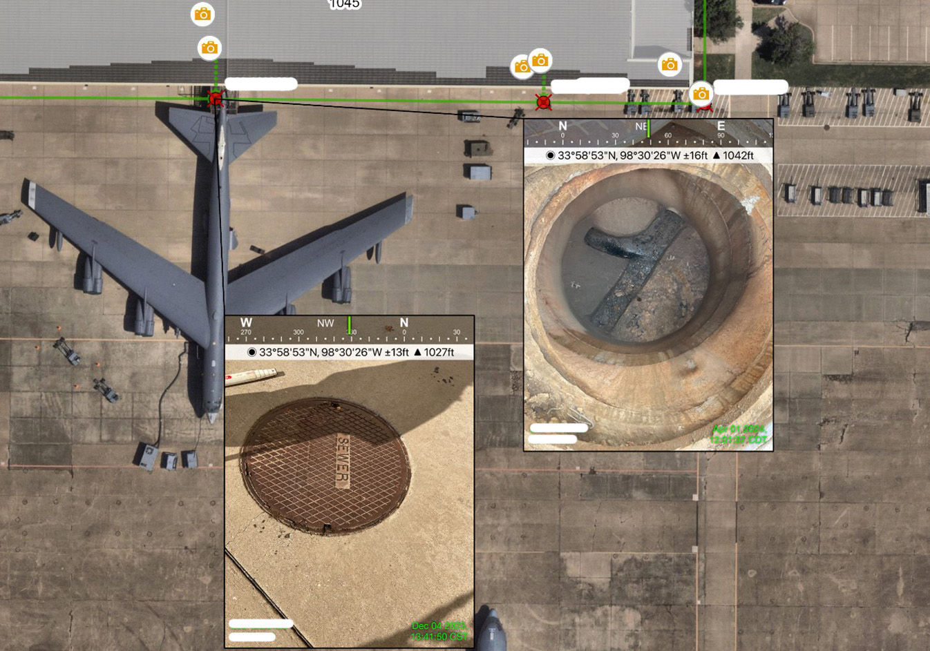 Sanitary sewer manholes were identified, with photos points linked to the corresponding location as geodatabase attachments.